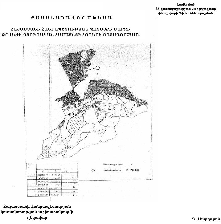 1. Հայաստանի Հանրապետության կառավարության 2006 թվականի մարտի 2-ի N 235-Ն որոշմամբ հաստատված` Հայաստանի Հանրապետության Կոտայքի մարզի Ջրվեժի գյուղական համայնքի հողերի օգտագործման ժամանակավոր սխեմայում` համաձայն հավելվածի, քաղաքացու սեփականությունը հանդիսացող 0,3217 հեկտար արդյունաբերության, ընդերքօգտագործման և այլ արտադրական նշանակության օբյեկտների հողերը Հայաստանի Հանրապետության օրենսդրությամբ սահմանված կարգով փոխադրել բնակավայրերի հողերի կատեգորիա` բնակելի կառուցապատման համար:
