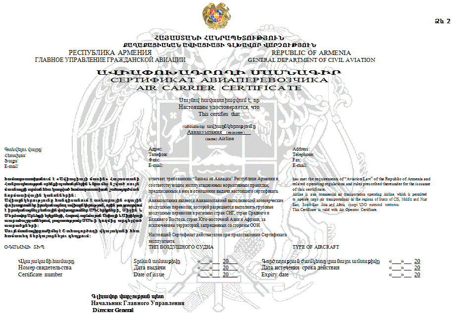 2. Օդանավ շահագործողի վկայական (Ձև 2) տրվում է օդային տրանսպորտի թռիչքային անվտանգության պահանջների ապահովման, դրանում անհրաժեշտ առանձնահատկությունները և սահմանափակումները սահմանելու նպատակով: