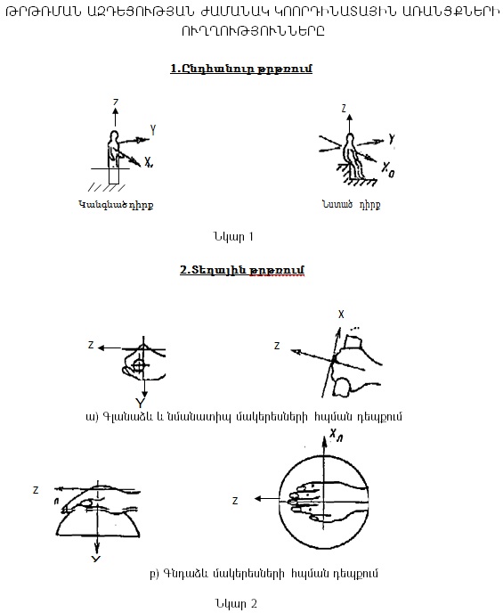 1) ընդհանուր թրթռման դեպքում - որտեղ Xը (սագիտալ` հետևից առաջ) և Yը (կողային` աջից ձախ) առանցքները հորիզոնական են և զուգահեռ հենման մակերեսին, իսկ Z-ը ուղղահայաց առանցք է` ուղղված նստարանի կամ հատակի հետ մարմնի հպման մակերեսին (ըստ նկար 1-ի).