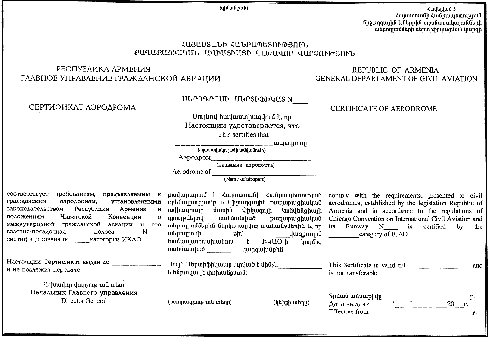 6. Հանձնաժողովի դրական եզրակացության դեպքում, Գլխավոր վարչության համապատասխան հրամանով Հայտատուին տրվում է «Աերոդրոմի Սերտիֆիկատ» (այսուհետ` Սերտիֆիկատ), համաձայն Կարգի հավելված 3-ի.