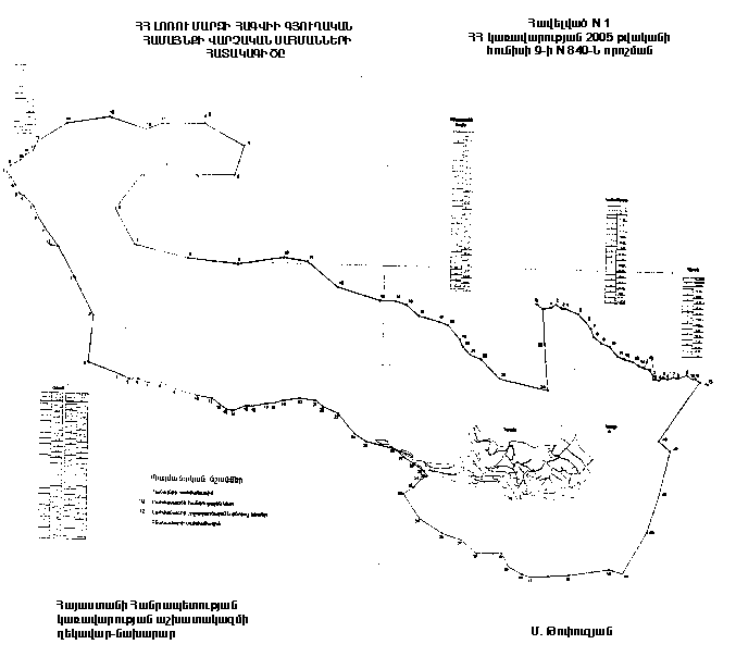 Մարզի համայնքների վարչական սահմաններից դուրս գտնվող հողերի, Օձուն և Հագվի գյուղական համայնքների «Ա» հանգուցային սահմանակետից սահմանագիծն անցնում է դեպի հարավ-արևելք, անցնելով թիվ 1 կետը: Նույն ջրբաժանով հասնում բլրի գագաթին թիվ 2 կետին, որից հետո սահմանագիծն անցնում է դեպի հարավ 474.9 մ ջրբաժանով հասնում բլրի թիվ 3 կետին: Թիվ 3 կետից սահմանագիծն անցնում է դեպի հարավ-արևելք 336.0 մ հատելով դաշտային ճանապարհը հասնում Դեբեդ գետի վտակի թիվ 4 կետին: Թիվ 4-29 կետերով սահմանագիծը նշված վտակով անցնում է դեպի հարավ-արևելք հասնում թիվ 30 կետին, որից հետո սահմանագիծը, ձախ վտակով անցնում է դեպի հարավ-արևմուտք թիվ 31-32 կետերով հասնում թիվ 33 կետին: Թիվ 33 կետից սահմանագիծն անցնում է դեպի հարավ-արևելք հասնում թիվ 34 կետին, հատելով ձորակը, վարելահողի եզրով, հատելով հաջորդ ճանապարհը հասնում թիվ 35 կետին: Թիվ 35 կետից սահմանագիծը հատելով ձորակը հասնում է թիվ 36 կետին և շարունակվում նույն ուղղությամբ հասնում ճանապարհի թիվ 37 կետին: Թիվ 37 կետից սահմանագիծը նշված ճանապարհով անցնելով թիվ 38-42 կետերով, շարունակվում է ջրբաժանով և հասնում վարելահողի եզրի թիվ 43 կետին, հասնում թիվ 44 սահմանակետին: Թիվ 44 սահմանակետից սահմանագիծը թեքվում է դեպի հյուսիս-արևելք, հատելով Օձուն գնացող ճանապարհը, ջրբաժանով անցնելով թիվ 45-46 սահմանակետերը, հասնում վարելահողի եզրի թիվ 47 սահմանակետին: Թիվ 47 սահմանակետից սահմանագիծն անցնում է դեպի հյուսիս-արևելք և ջրհավաքով հասնում Հագվի, Աքորի և Օձուն համայնքների տարածքների բաժանման «Ե» հանգուցային կետին: