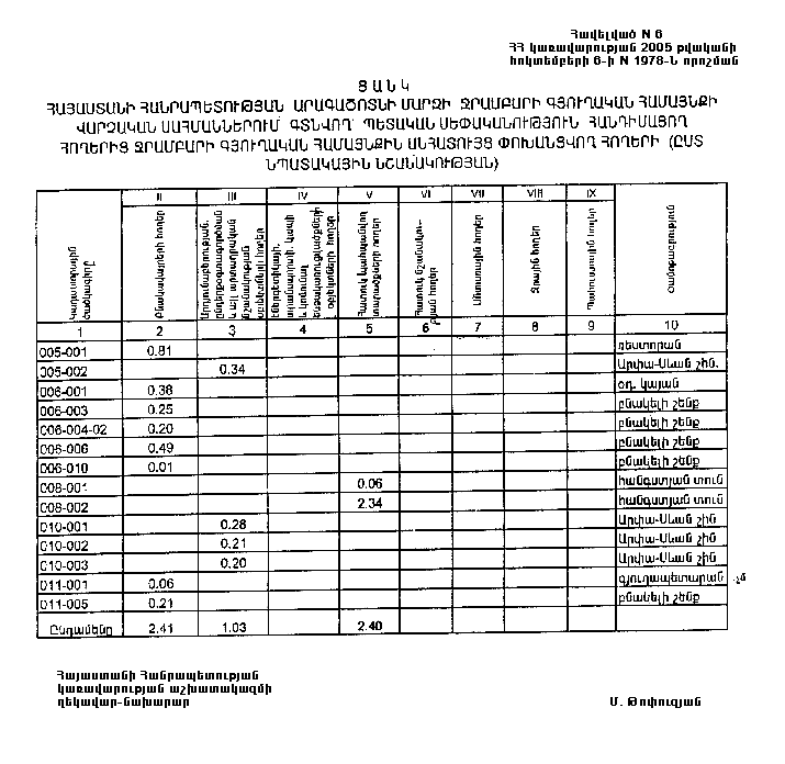 6. Թույլատրել Հայաստանի Հանրապետության կառավարությանն առընթեր անշարժ գույքի կադաստրի պետական կոմիտեի նախագահին Հայաստանի Հանրապետության պետական գեոդեզիական ցանցի հավասարակշռման արդյունքների հիման վրա Հայաստանի Հանրապետության վարչատարածքային միավորների սահմանանիշերի կոորդինատների ժողովածուի հրատարակումից հետո հողային ֆոնդի ընթացիկ հաշվառման ժամանակ Հայաստանի Հանրապետության Արագածոտնի մարզի Ջրամբարի գյուղական համայնքի հողային հաշվեկշռում սահմանված կարգով կատարել համապատասխան փոփոխություններ: