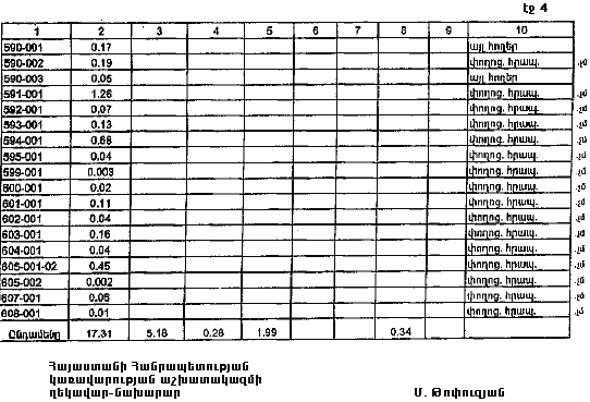 4. Ընդունել ի գիտություն Հայաստանի Հանրապետության Գեղարքունիքի մարզի Արփունքի գյուղական համայնքի հողային ֆոնդի առկայության և բաշխման մասին հաշվետվությունը` 2005 թվականի հունվարի 1-ի դրությամբ` համաձայն NN 8 և 9 հավելվածների: