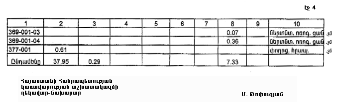 4. Ընդունել ի գիտություն Հայաստանի Հանրապետության Արագածոտնի մարզի Տեղերի գյուղական համայնքի հողային ֆոնդի առկայության և բաշխման մասին հաշվետվությունը` 2005 թվականի հունվարի 1-ի դրությամբ` համաձայն NN 8 և 9 հավելվածների: