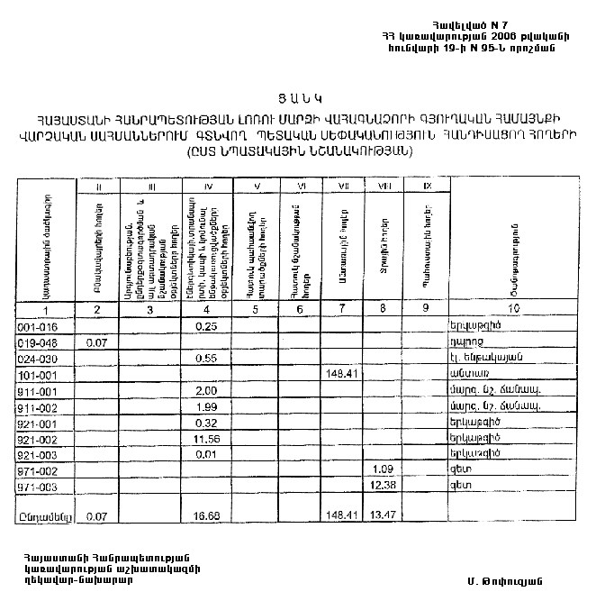 7. Հայաստանի Հանրապետության Լոռու մարզպետին` Հայաստանի Հանրապետության կառավարության 2000 թվականի հոկտեմբերի 23-ի N 656 որոշմամբ սահմանված կարգով` սկզբնական հաշվառման տվյալների հիման վրա ապահովել մարզի տարածքում ընթացիկ հաշվառման աշխատանքների իրականացումը:
