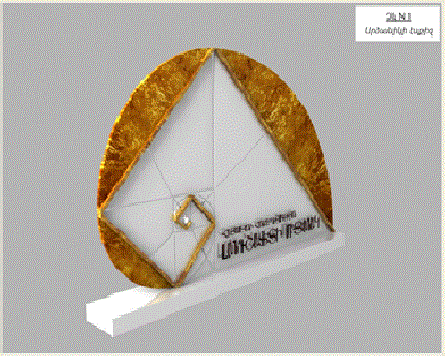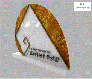 2. Արձանիկը նախատեսված է պատրաստել 13 մմ հաստություն ունեցող թափանցիկ բյուրեղապակուց, որի պարույրի վերևի եզրագծով և ոսկեգույն մետաղից պատրաստված բեկյալ գծի միջև մակերեսը 7.0 մմ հաստությամբ ուռուցիկ, որոշակի մշակվածք (ֆակտուրա) ունեցող ոսկեգույն բյուրեղապակուց է:
