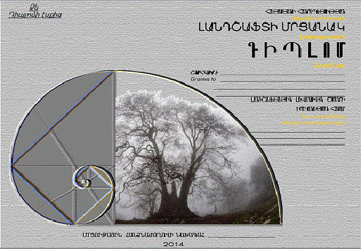 1. Հայաստանի Հանրապետության լանդշաֆտի մրցանակի դիպլոմի ֆոնը մոխրագույն է (Gray 25 տոկոս), ունի որոշակի ֆակտուրա, որի վրա ձախ կողմում պատկերված են «Աստվածային պարույրը», գույնը` Gray 50 տոկոս, և Լեռնային Ղարաբաղի Հանրապետության Սխտորաշեն գյուղի մոտակայքում գտնվող ավելի քան 2000 տարեկան արևելյան սոսին (չինար): Աջ հատվածում` հայերենով և անգլերենով գրված է Հայաստանի Հանրապետության (ArTarumianIshxan, 14B) Լանդշաֆտի մրցանակ (ArTarumianIshxan, 24B), Դիպլոմ (ArTarumianIshxan, 48B)` համաձայն ձևի: