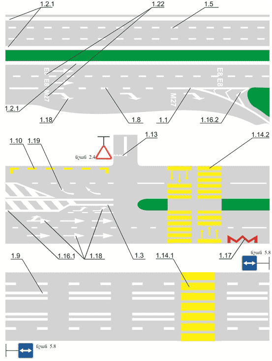1) գլխավոր ճանապարհ` 2.1` «Գլխավոր ճանապարհ», 2.3.1` «Հատում երկրորդական ճանապարհի հետ», 2.3.2 - 2.3.7` «Երկրորդական ճանապարհի հարում», կամ 5.1` «Ավտոմայրուղի» նշաններով նշված ճանապարհ հատողի (հարողի) նկատմամբ կամ կոշտ ծածկույթով (ասֆալտբետոն, ցեմենտբետոն, քարե նյութեր և այլն) ճանապարհ հողային ծածկույթ ունեցողի նկատմամբ, կամ էլ ցանկացած ճանապարհ մերձակա տարածքներից դուրս եկող ճանապարհի նկատմամբ: Առանց ծածկույթի հողային ճանապարհի վրա, անմիջապես խաչմերուկից առաջ, ծածկույթով հատվածի առկայությունն այդ ճանապարհը հատվող ծածկույթով ճանապարհին հավասարազոր չի դարձնում.